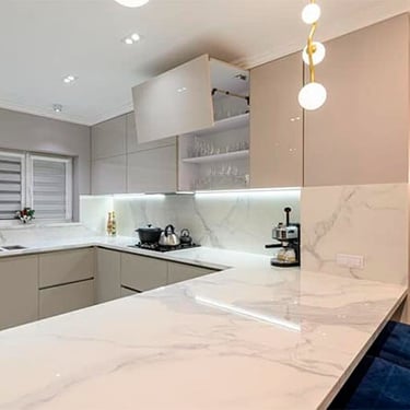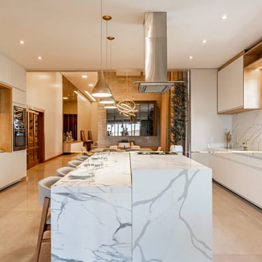 Cozinha planejada em mármore que une sofisticação, exclusividade e acabamento de alto padrão. Ideal para projetos elegantes, o mármore proporciona um visual refinado e atemporal, valorizando o ambiente com suas texturas e veios naturais únicos. Desenvolvida sob medida, oferece harmonia entre estética e funcionalidade, criando um espaço moderno, organizado e pensado para proporcionar conforto e requinte no seu dia a dia.
